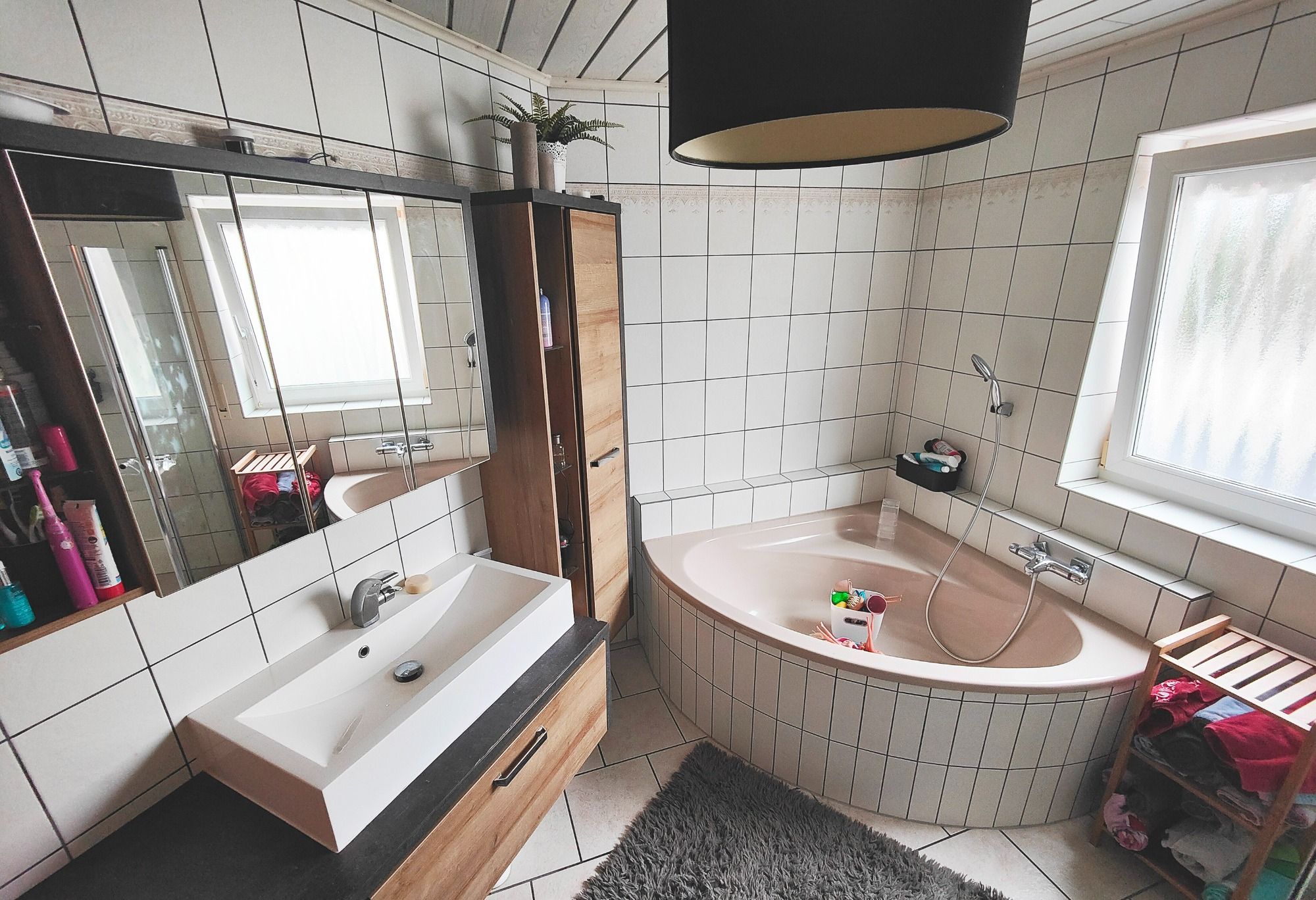 Das große Elternschlafzimmer überzeugt mit viel Raum und einem besonderen Extra: einem angrenzenden Ankleideraum mit Fenster. Dieser eignet sich nicht nur als begehbarer Kleiderschrank, sondern bietet auch praktische Anschlüsse für Waschmaschine und Trockner – clever und alltagstauglich gelöst. Ein echtes Highlight ist das helle Hauptbad: klassisch weiß gefliest, mit einer großzügigen Eckbadewanne, separater Dusche, Tageslichtfenster und ausreichend Platz für die ganze Familie.