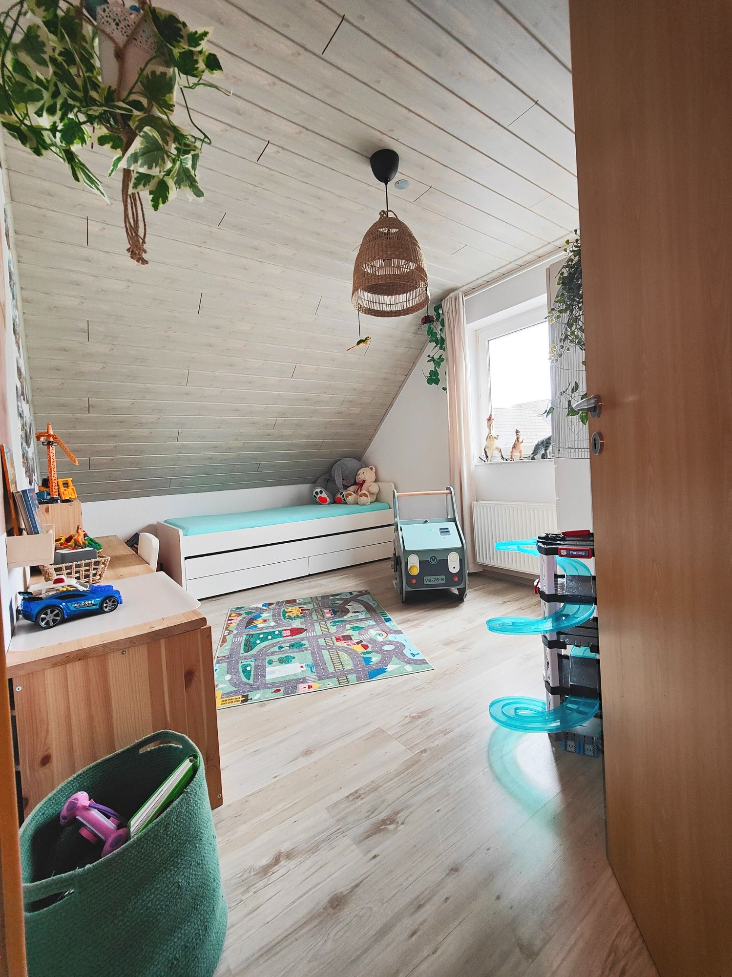 Das ausgebaute Dachgeschoss bietet Ihnen noch einmal richtig viel Raum zur Entfaltung. Der großzügige, offene Raum ist mit hellem Laminatboden ausgestattet und durch das große Fenster wunderbar lichtdurchflutet. Eine freundliche, ruhige Atmosphäre macht diesen Bereich zum perfekten Rückzugsort. Ob als Homeoffice, Homegym, Kinderzimmer oder Gästebereich – hier ist Platz für Ihre Ideen. Die angenehme Raumhöhe und das offene Konzept verleihen dem Dachgeschoss einen ganz besonderen Charme.